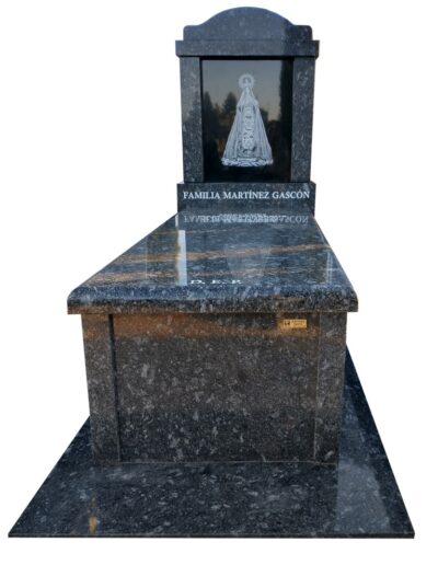 Tapa de 6 cm con canto redondeado. Frente en Negro Sudáfrica con escultura en la piedra.