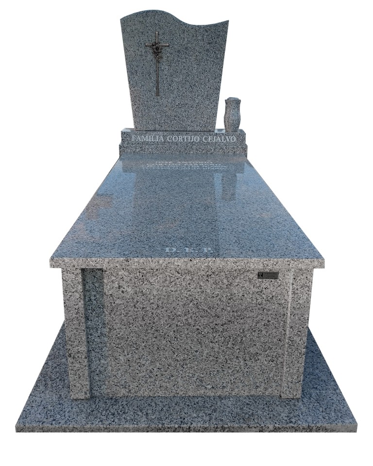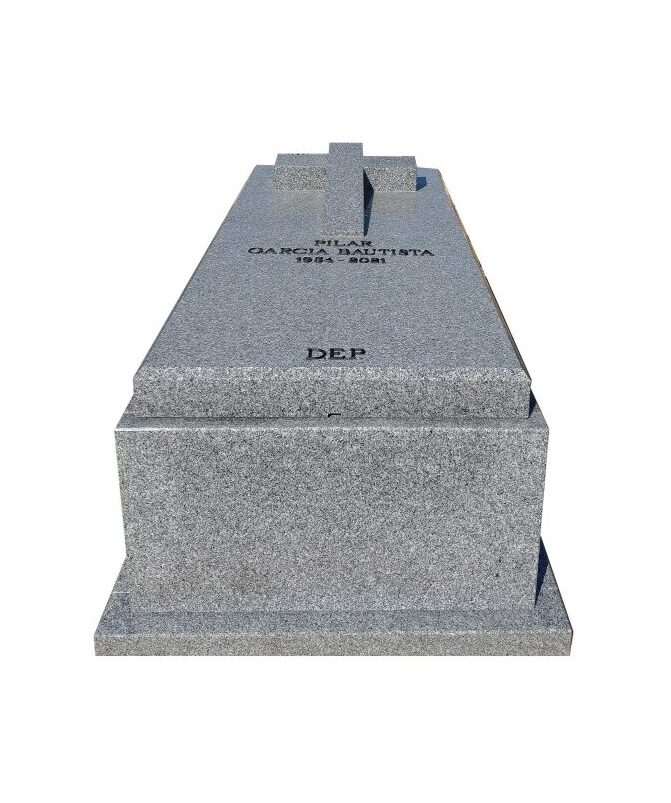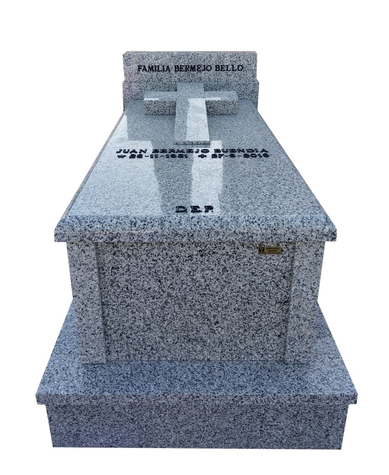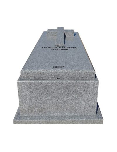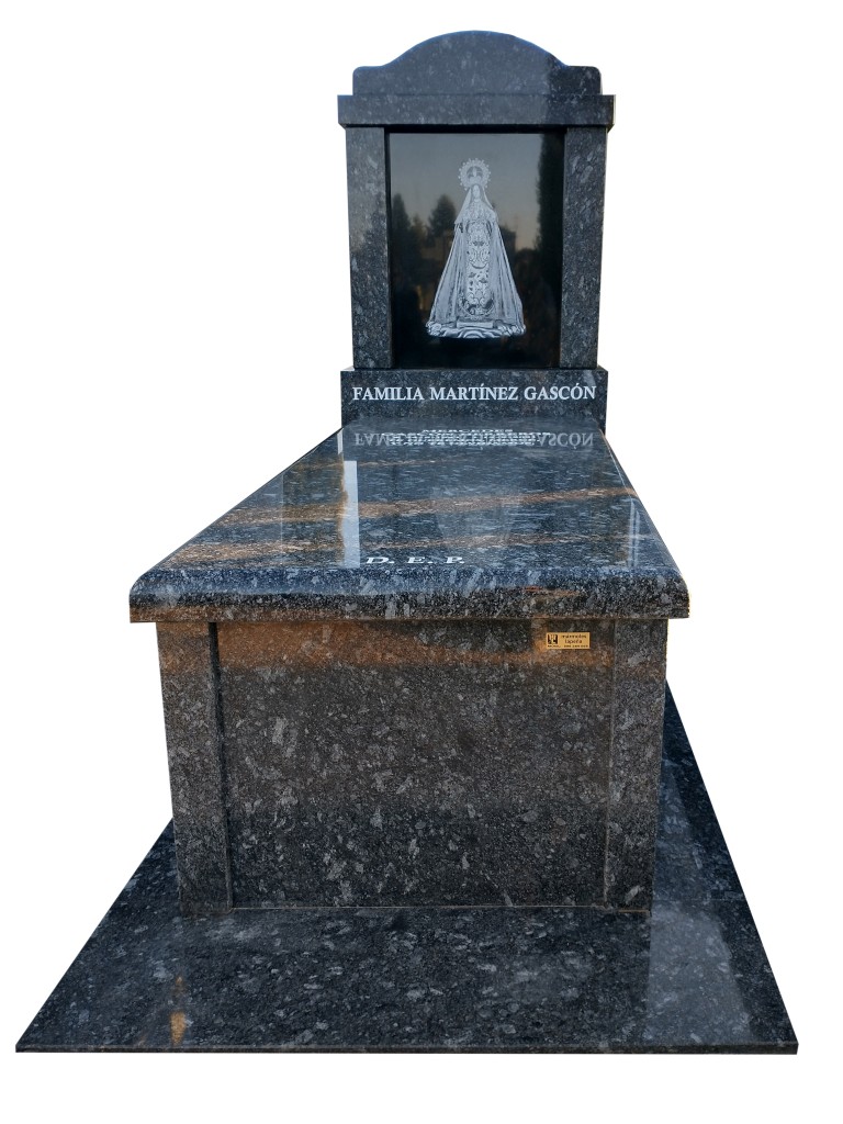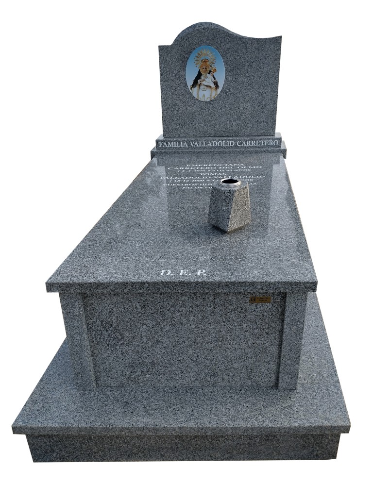 Tapa de 8 cm con canto redondeado. Escultura en la piedra y grabado a láser. Escalón recubierto.